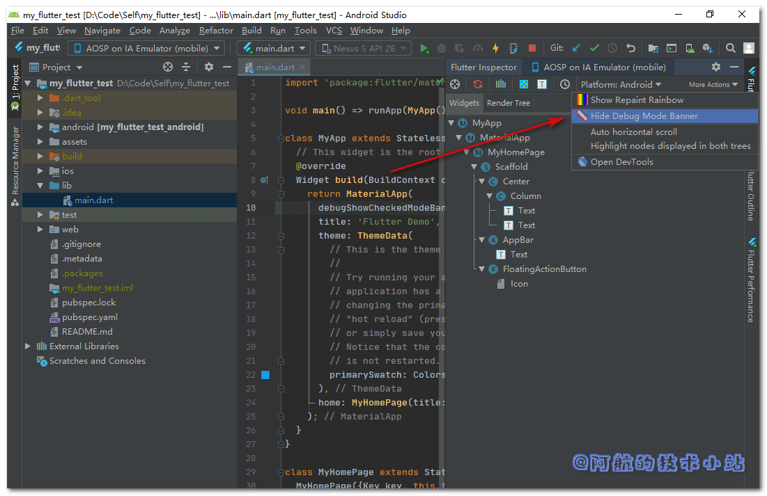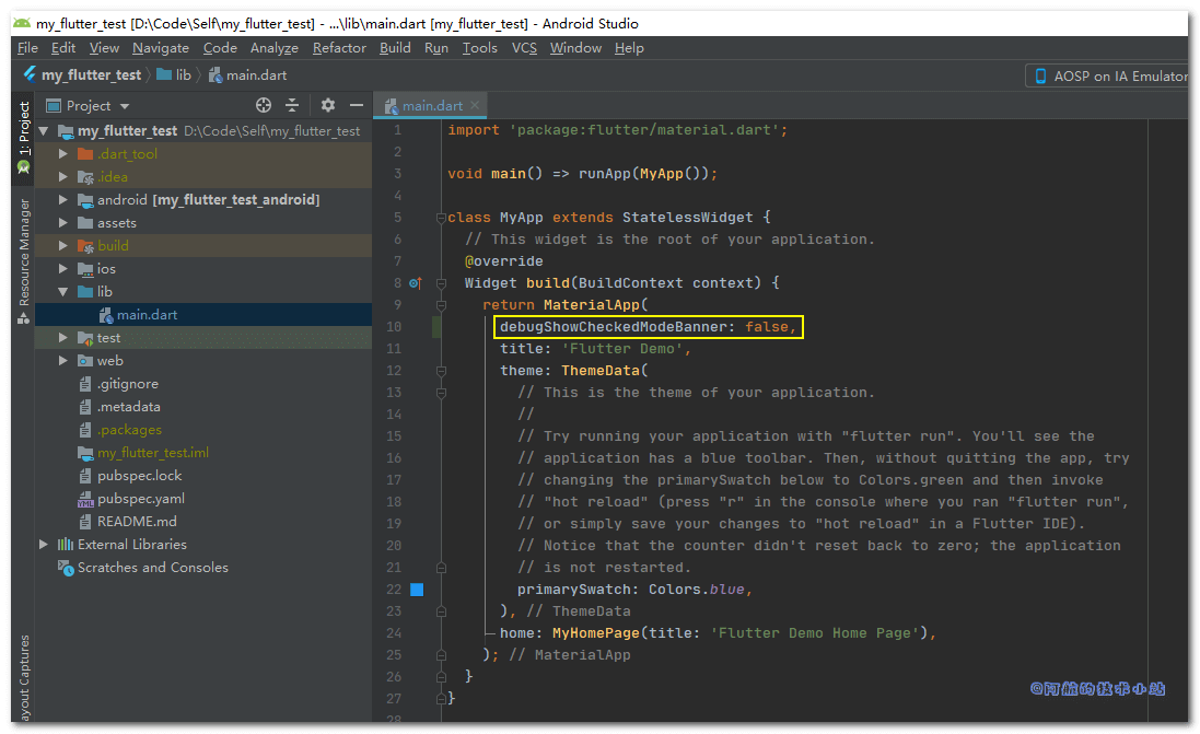 在使用Flutter进行开发时, 右上角会出现一个DEBUG的标识. 测试的时候倒是无所谓, 但是APP上线前肯定要将其去掉. 证明其是一个开发完成的、完整的APP. 这篇非常简短的博客将会记录如何去掉Flutter右上角的DEBUG标识. 一共有两种方式, 你可以按需来选择!