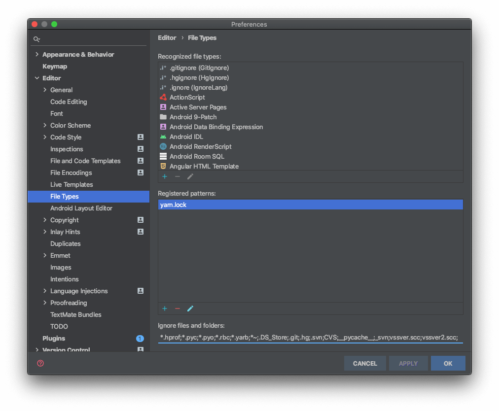 可以看到下方有一个输入框Ignore files and folders,在下面添加一条: