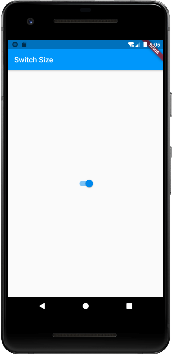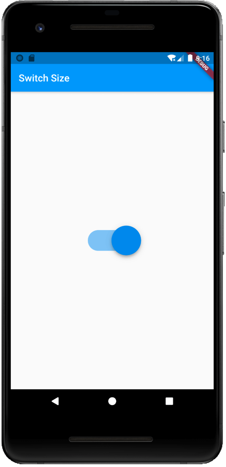 ` import 'package:flutter/material.dart'; void main() => runApp(MyApp()); class MyApp extends StatelessWidget { @override Widget build(BuildContext context) { return MaterialApp( title: 'Switch Size', home: MyHomePage(), ); } } class MyHomePage extends StatefulWidget { MyHomePage({Key key}) : super(key: key); @override _MyHomePageState createState() => _MyHomePageState(); } class _MyHomePageState extends State { bool _enabled = true; @override Widget build(BuildContext context) { return Scaffold( appBar: AppBar( title: Text('Switch Size'), ), body: Center( child: Column( mainAxisAlignment: MainAxisAlignment.center, children: [ Switch( value: _enabled, onChanged: (bool) { _enabled = bool; setState(() {}); }), ], ), )); } }`